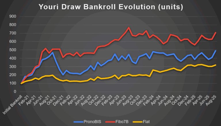 *Gains théoriques avec 1 unité = 10€ avec la méthode Fibo7b à fin août 2025, correspondant à 607 unités de gain. Pour équivalence, les autres stratégies ont permis d’obtenir + 390 unités (Pronobis) et +215 unités (flat ou mise fixe). Le résultat est obtenu en retranchant les 100 unités de bankroll initial présent sur le graphique ci dessus.