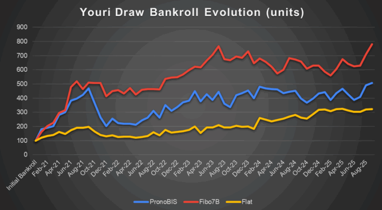 *Theorical earnings with 1 unit = €10 using the Fibo7b method at the end of August 2025, corresponding to 680 winning units. For equivalence, other strategies yielded +407 units (Pronobis) and +223 units (flat or fixed stake) on the same period. The result is obtained by subtracting the 100 units from the initial bankroll shown in the graph above.